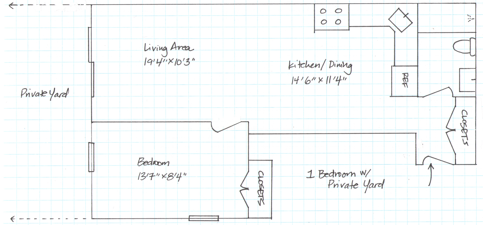 Open kitchen features full-sized appliances including gas stove and dishwasher. (Photos taken prior to all appliances being installed.) The building features central air-conditioning which is clean and quiet. 20-foot long living room. Private yard off the living room offers a partial awning. Pets ok under 20 pounds. The apartment is shown by appointment. Contact Maria to view: 347-248-5825.